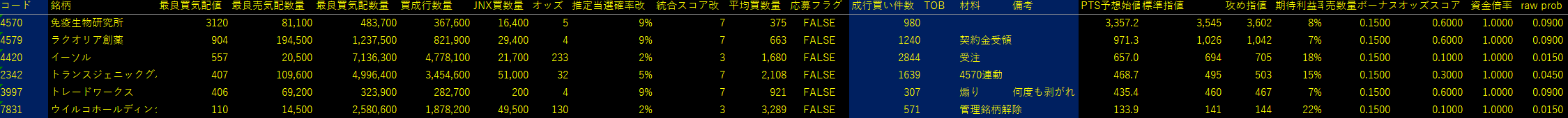 オッズが低めだが、成行買い件数が多く、JNXもそこそこの厚みがあり、材料も明確だったので4579に参加。