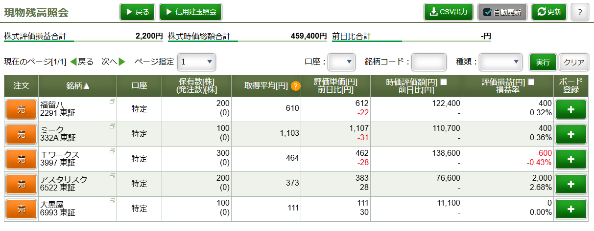 引け売り注文を忘れたので全て現引きして現在の評価損益を表示。