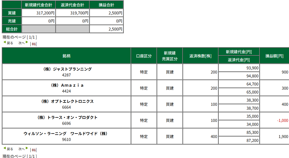 9610は結局引けまでに売れて参加しなかったが、低位なのに10円ほど引け前に急落して指値が300株刺さったのでそこそことれた。