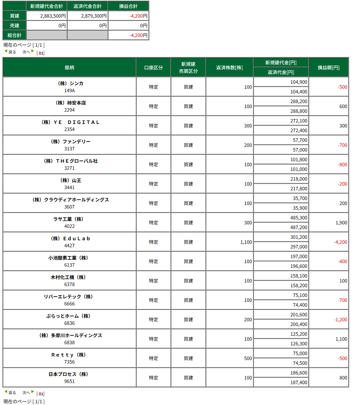 引けの候補は思ったより多かったが、結果は微妙。全体的に変わらず引けが多く、4427が引け間際に急落して単独でマイナス要因となった。